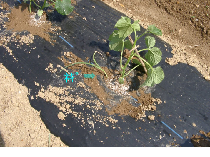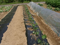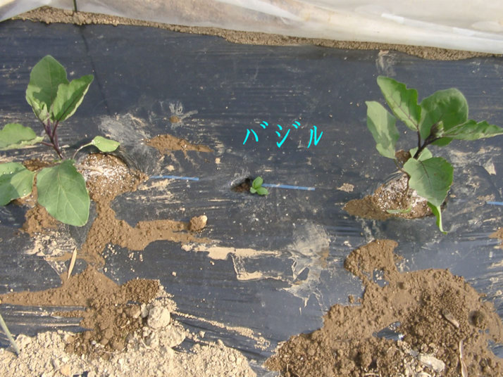 は、茄子を植える茄子苗(千両2号)20本を定植した 株間にバジルの苗を植えた キュウリの株元に葱苗を植えた