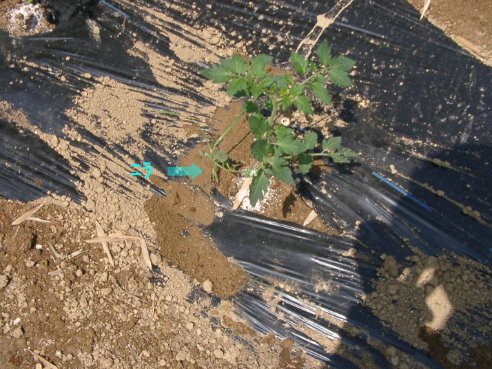 する。ミニトマトの右側3本の黒マル