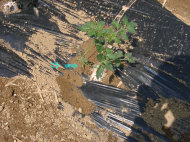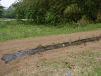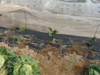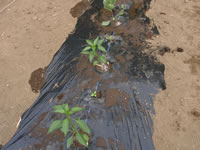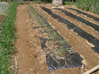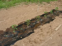 2009年5月9日 開墾したばかりの畝に、茄子、ピーマン、唐辛子の苗を試験的に植えてみた 辛くない唐辛子の苗 ピーマンは東側で日当たりが良くない場所